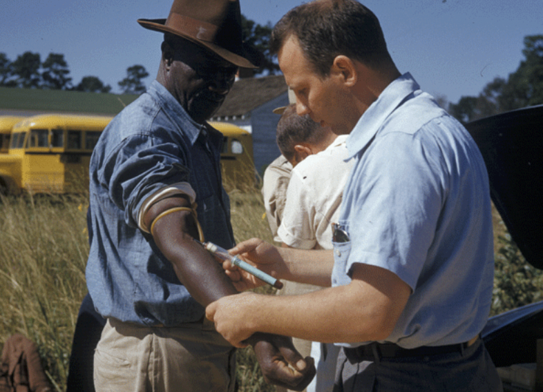 Beginning in 1932, the U.S. Public Health Service recruited hundreds of Black men in Alabama, most of whom were poor sharecroppers, under the promise of free medical care. In reality, researchers withheld treatment for syphilis even after penicillin became widely available in the 1940s. According to the National Institute of Health, participants were never informed of their diagnoses, and many died or suffered severe complications as a result; the study continued for forty years.