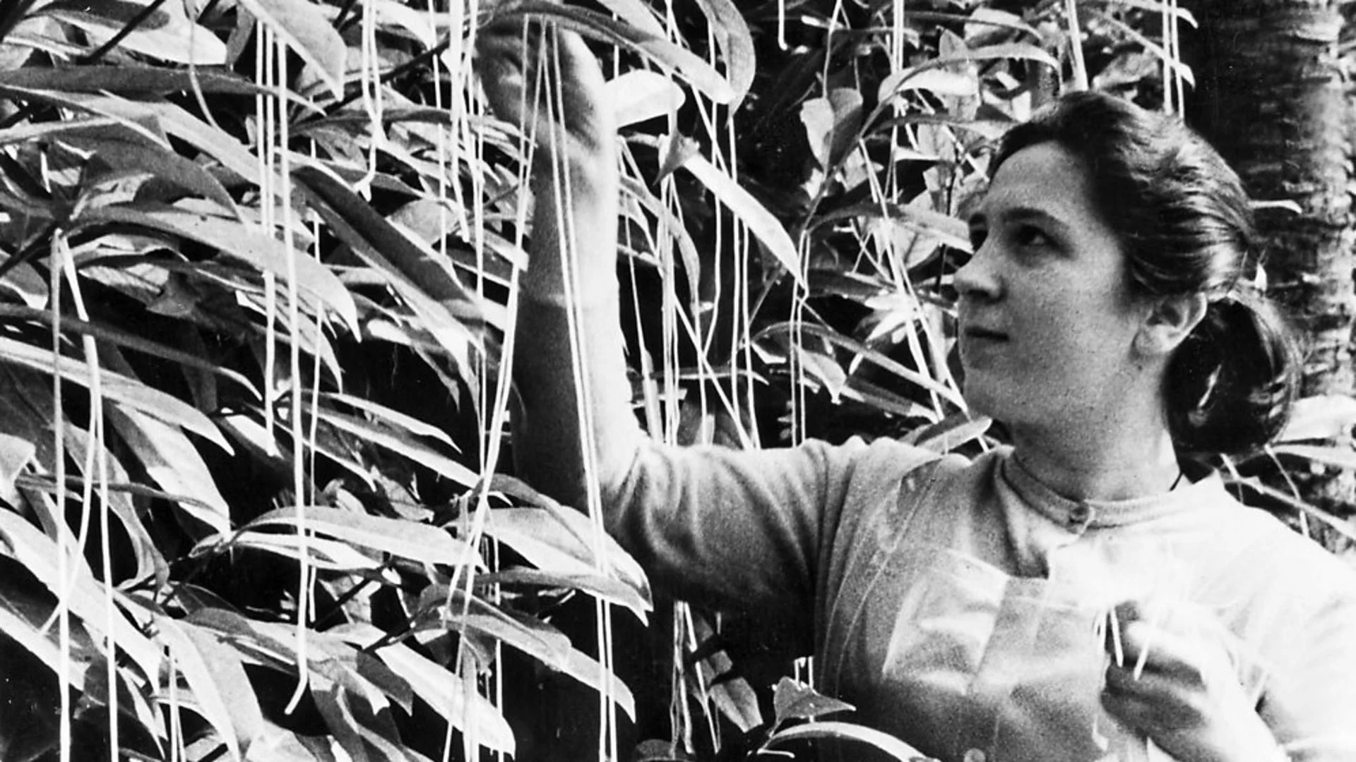 A woman harvesting spaghetti trees. Courtesy of BBC.