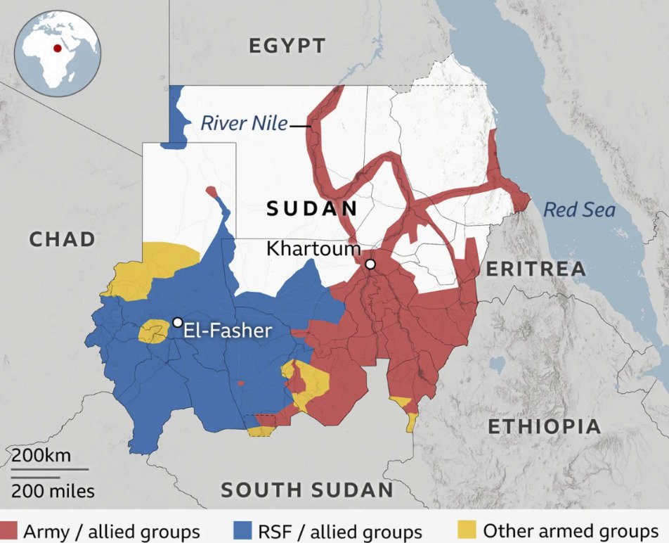 Map of RSF and SAF-controlled areas as of October 28th, 2025.