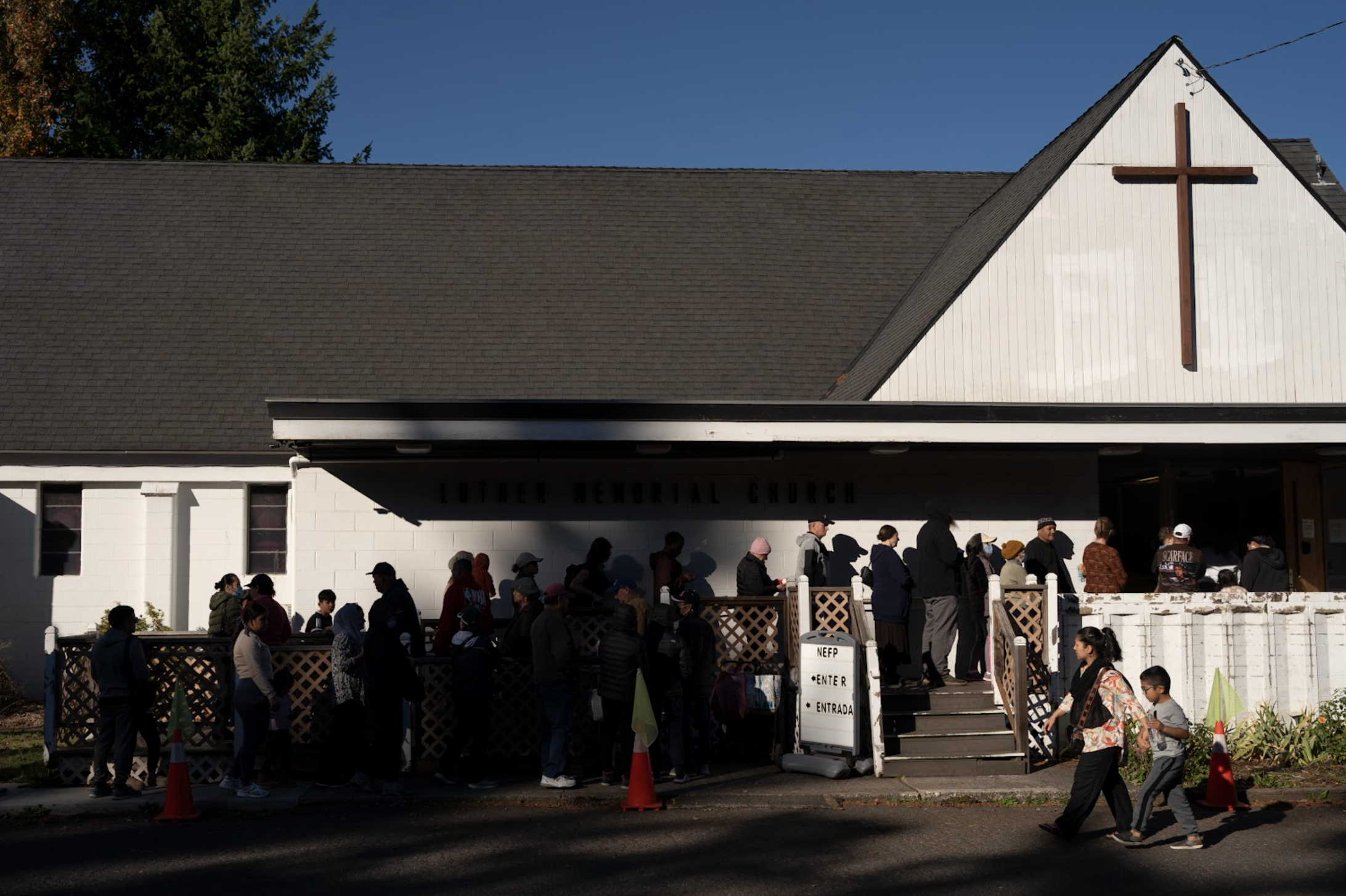 Line to get food in front of Northeast Emergency Food Program food bank on Tuesday, October 21st, 2025. Courtesy of Eli Imadali at OPB.