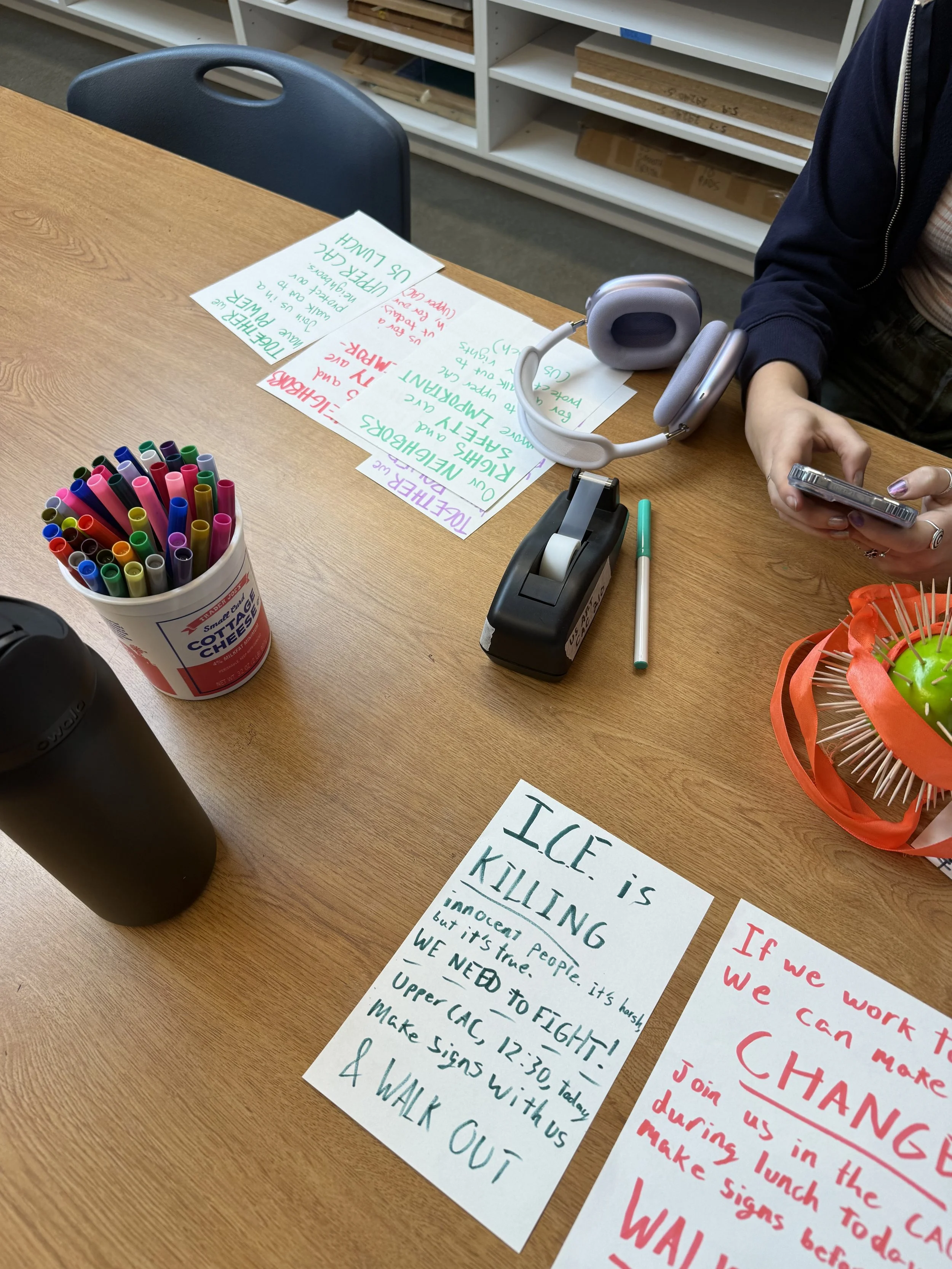 For inspiration, Andrew Cole ‘28, who attended the walkout, said he and his peers drew upon messages they had seen on social media. His own sign, reading “I like my ICE crushed,” included a slogan from Instagram Reels. Other posters read “Abolish ICE,” “CowardICE,” “Deport the Nazis,” “Secret Pol-ICE,” “Strike to melt ICE,” and “Protect our neighbors.”