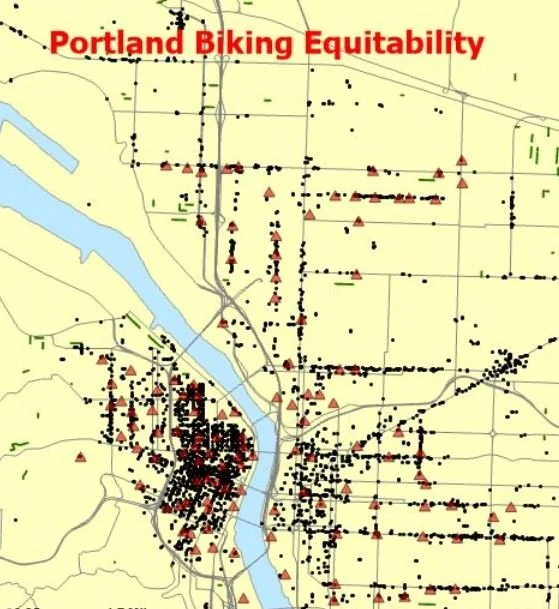 Courtesy of August Walrod ‘26. A GIS map of Portland biking infrastructure equitability designed during PCC class (black dots= bikeshare bikes, red triangles= bikeshare stations).