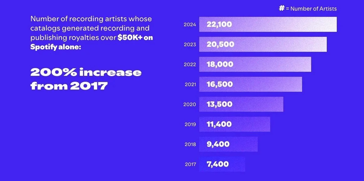 According to music journalist Murray Stassen, “22,100 artists generated $50,000 or above in combined recording and publishing royalties from Spotify in 2024, up 200% from 2017.” Artists with a mid-range of listeners are often not able to make a sustainable living off of Spotify compared to the rates they would make on other platforms.