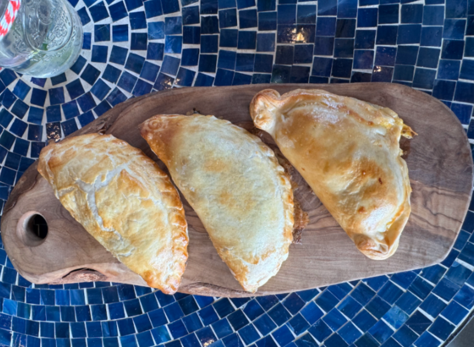 The two empanadas on the left are the abuela chona empanadas. The one on the right is the pollo spicy empanada. Photo by Erin Chow ‘25