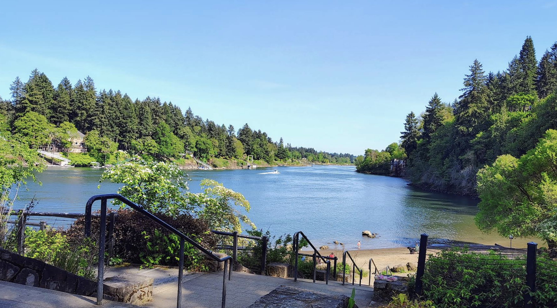 Technically outside of the City of Portland, George Rogers Park is a relaxing and fun riverside park in Lake Oswego. The park includes a large forested area with a creek inside it, two baseball fields, a soccer field, two outdoor tennis courts, a playground, onsite parking lots, an open grass circle, and a stretch of beach.